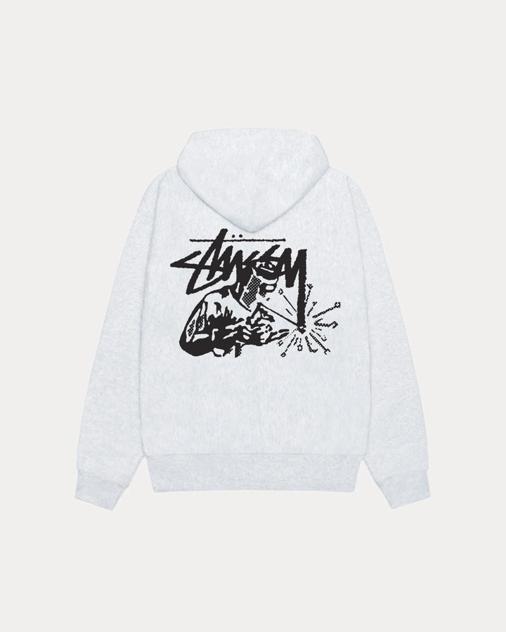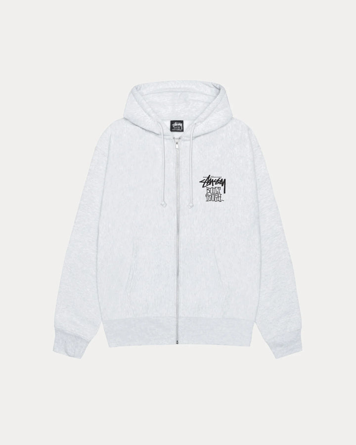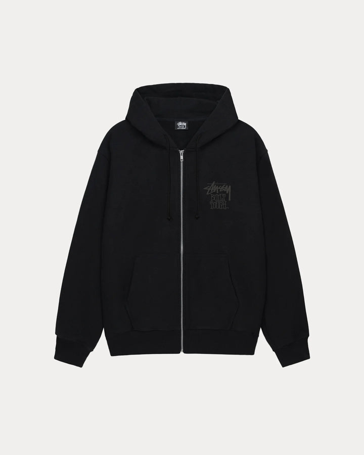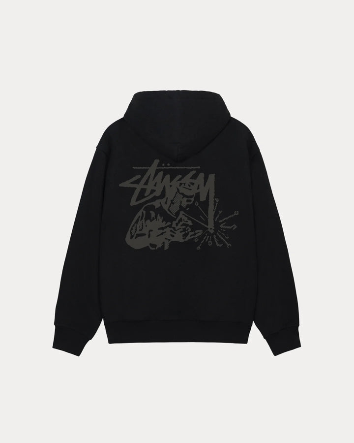 Relaxed fit zip-front fleece hoodie in a heavyweight 430gsm cotton blend. Screenprinted graphics at left chest and across back.